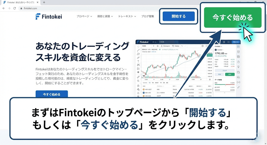 まずはFintokeiのトップページから「開始する」もしくは「今すぐ始める」をクリックします。