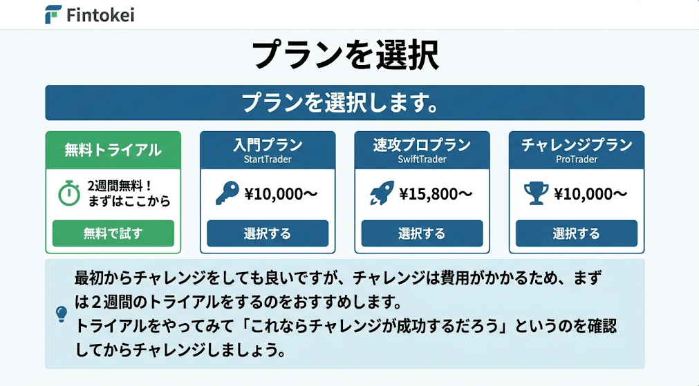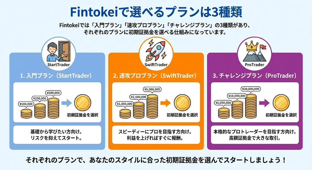 Fintokeiでは「入門プラン」「速攻プロプラン」「チャレンジプラン」の3種類があり、それぞれのプランに初期証拠金を選べる仕組みになっています。