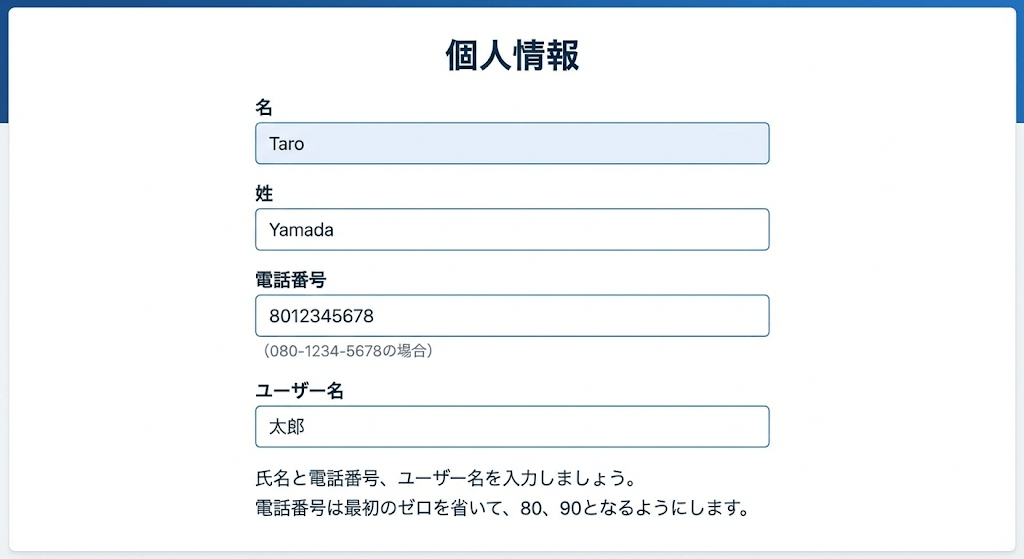 氏名と電話番号、ユーザー名を入力しましょう。