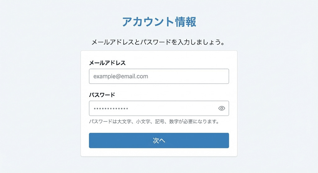 パスワードは大文字、小文字、記号、数字が必要になります。