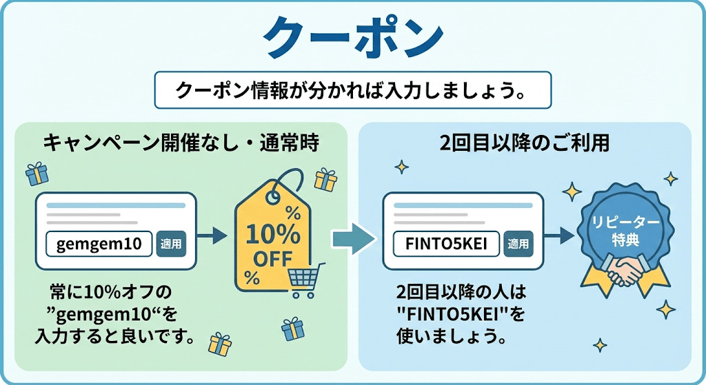 キャンペーンなどが開催されていなければ、常に10%オフの”gemgem10“を入力すると良いです。