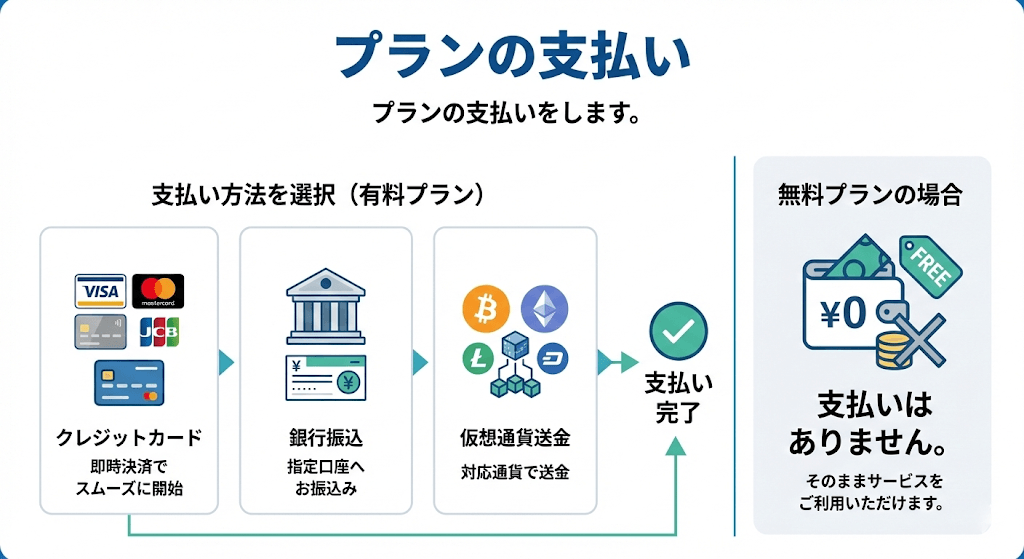 支払い方法はクレジットカード、銀行振込、仮想通貨送金があります。