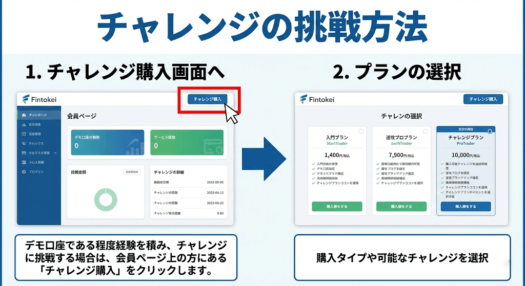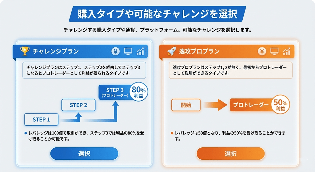 チャレンジする購入タイプや通貨、プラットフォーム、可能なチャレンジを選択します。
