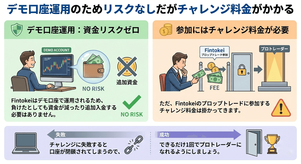 デモ口座運用のためリスクなしだがチャレンジ料金がかかる