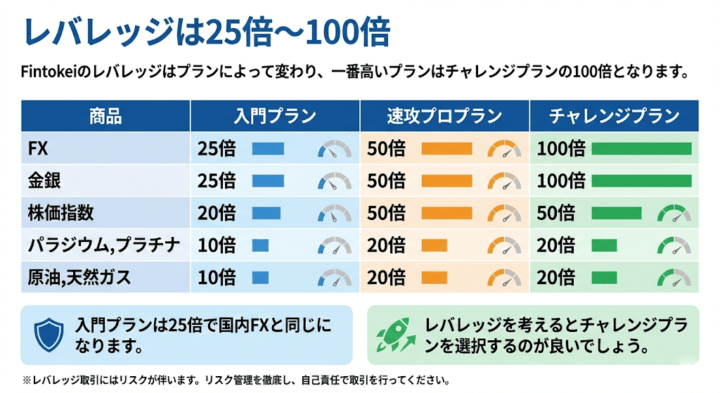 Fintokeiのレバレッジはプランによって変わり、一番高いプランはチャレンジプランの100倍となります。