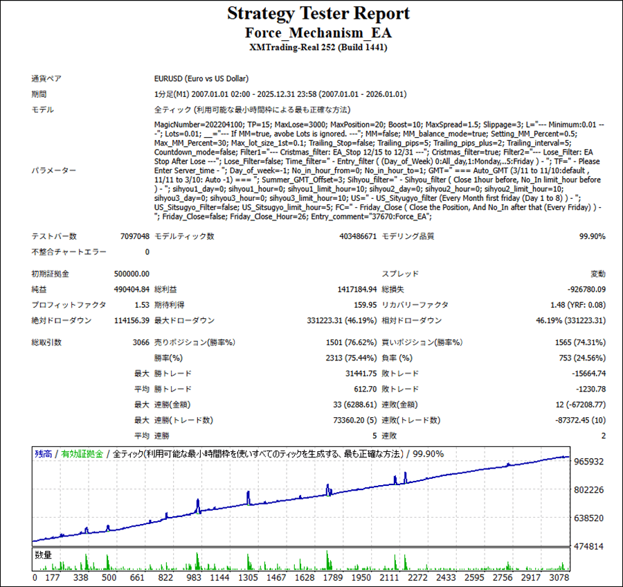 Force_Mechanism_EAを2007年からバックテストをしてみると、無事に生き残って利益が出ました。