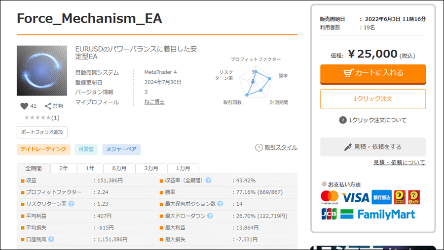 Force_Mechanism_EAの公開成績を見ると、含み損が多少ありつつも右肩上がりになっています。
