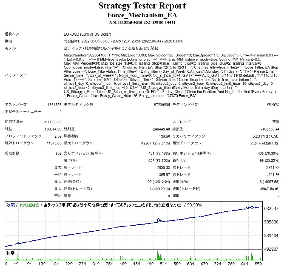Force_Mechanism_EAのリリース後のバックテスト結果(≒フォワード結果)は以下のようになりました。