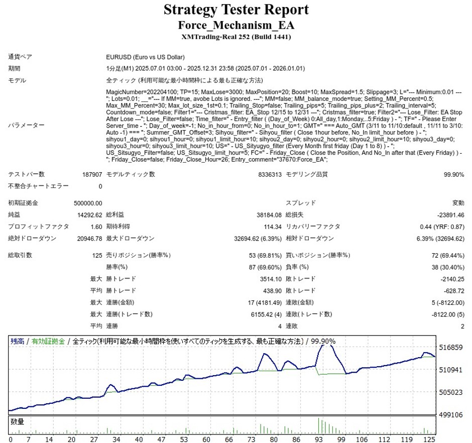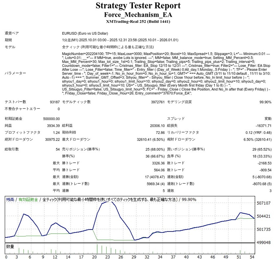 GogoJungleのForce_Mechanism_EAのバックテストをしてきました。過去1年、6ヶ月、過去3ヶ月、リリース後ともにプラスでした。