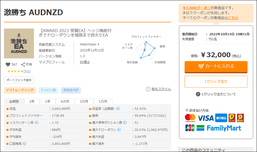 激勝ち AUDNZDは公開成績を見ると、リリースから利益を積み重ねていて、最大ドローダウンも低めです。