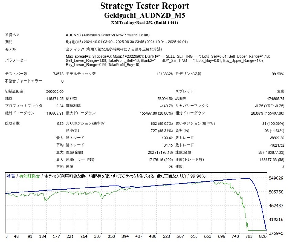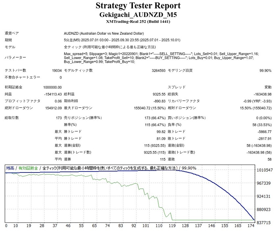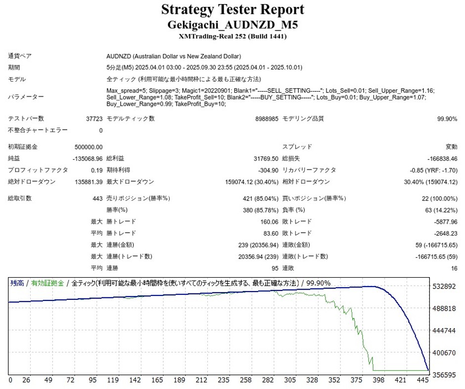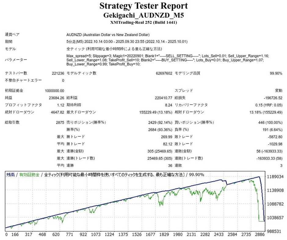 激勝ち AUDNZDのリリース後のバックテスト結果(≒フォワード結果)は以下のようになりました。