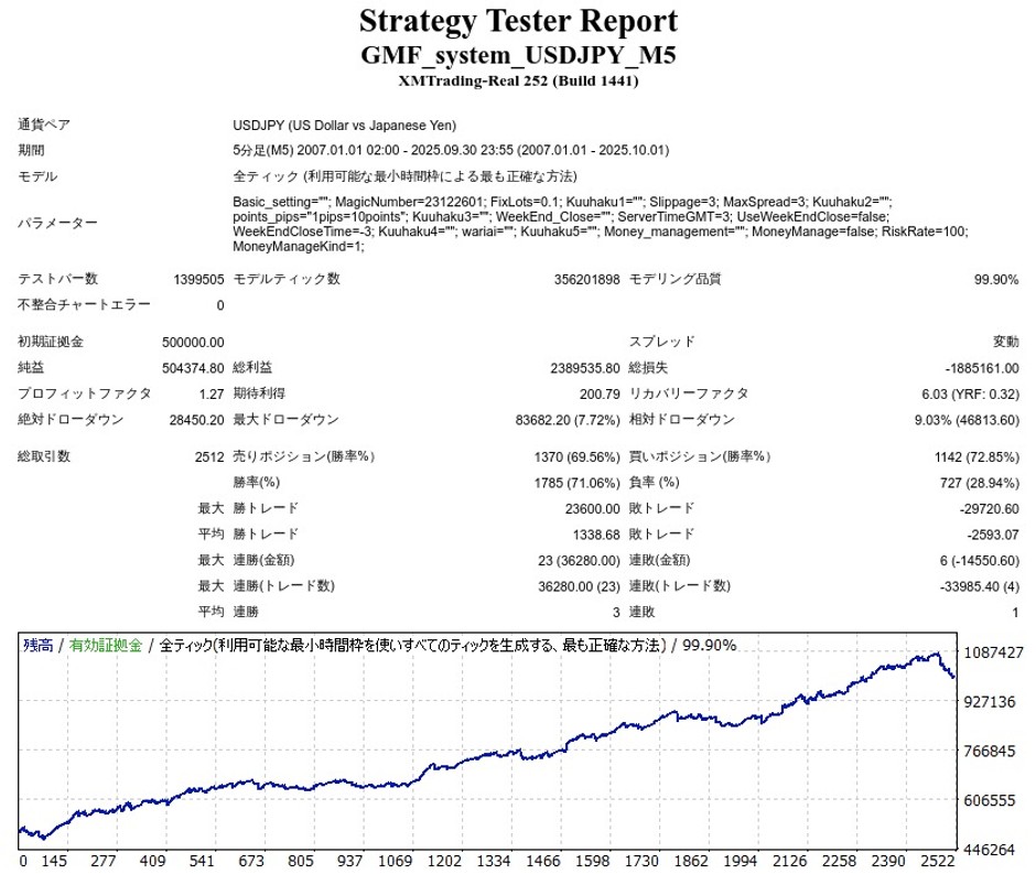 | 初期証拠金 | 500,000円 | 勝率 | 71.06% |