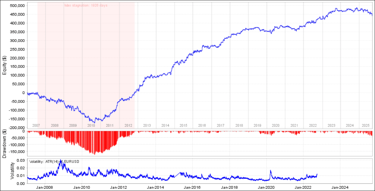 - 下方の赤色のグラフ:ドローダウン(山が大きいとドローダウンが大きい)