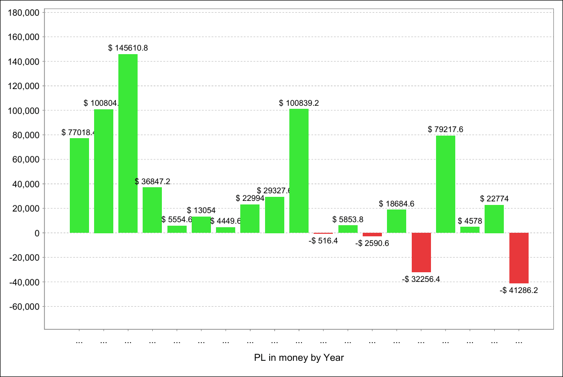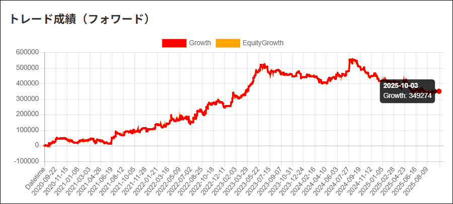 QuantAnalyzerを使って5通貨ペアを合計すると、過去18年間で361万円の収益となり、リリース後の成績は+31.5万円となりました。
