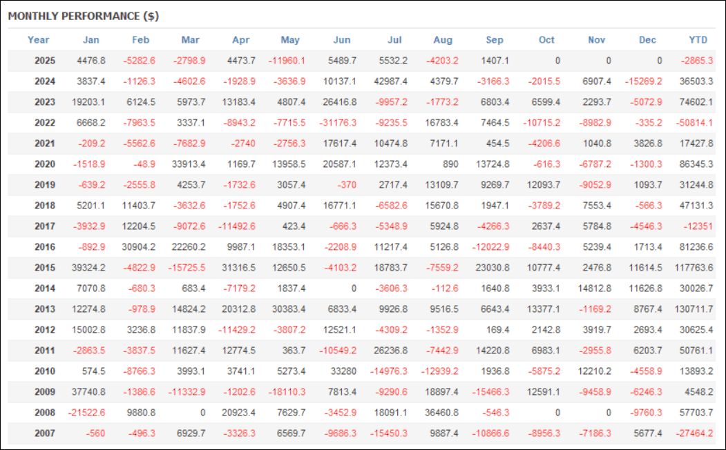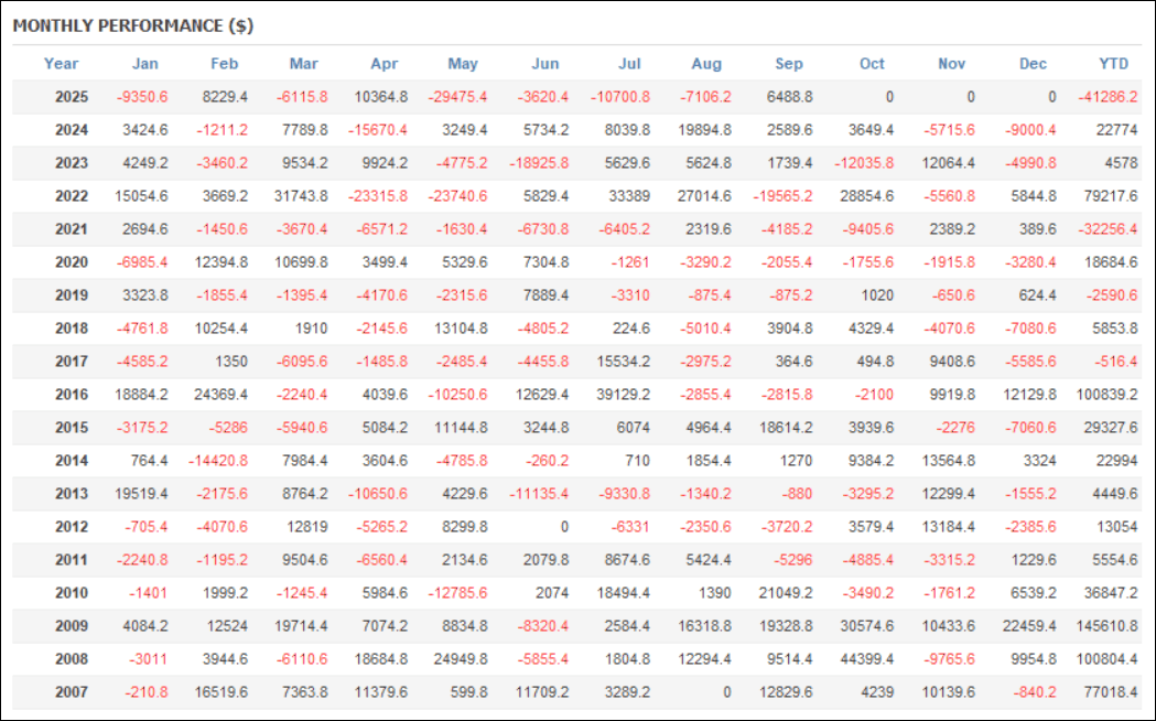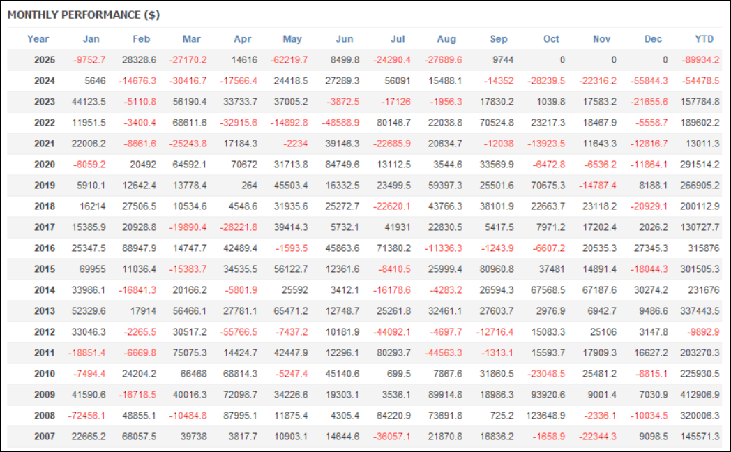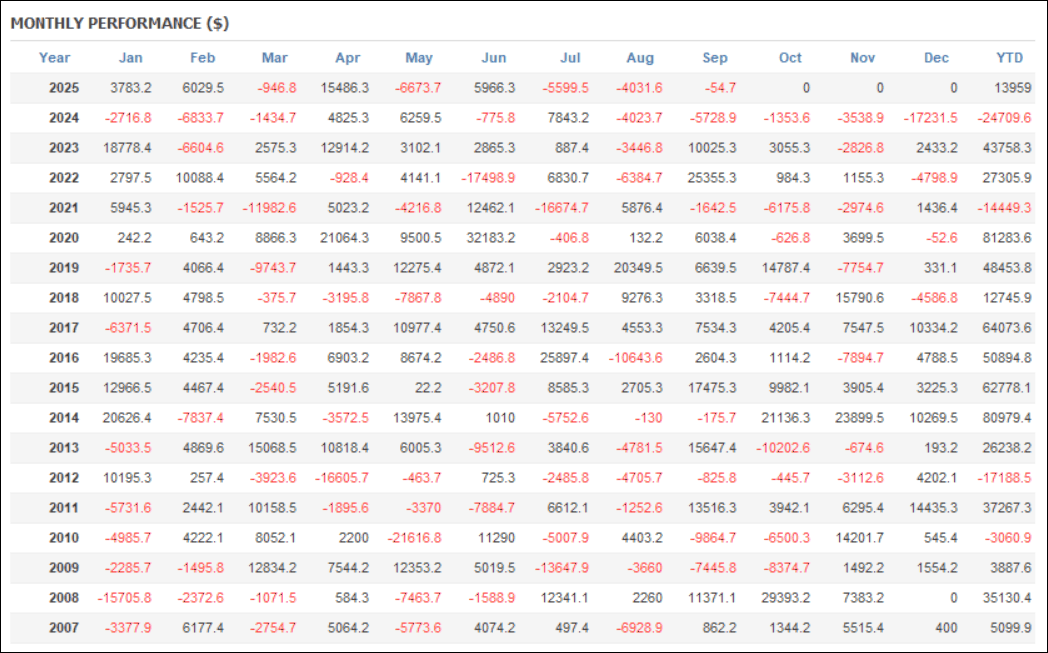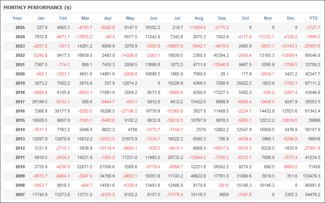 年次の成績を見ると、2012年と2024年、2025年はマイナスでそれ以外はプラス成績です。