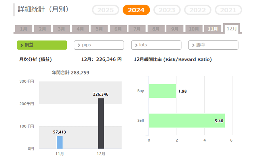 月次分析を見ると、2025年は今のところプラス成績で、2024年もプラスです。