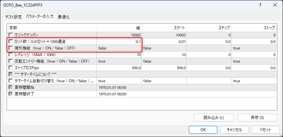 GOTO-Bee(ゴトー日)ではデフォルトでは複利設定がONになっています。検証では「0.1ロット、複利OFF(固定)」で行っています。