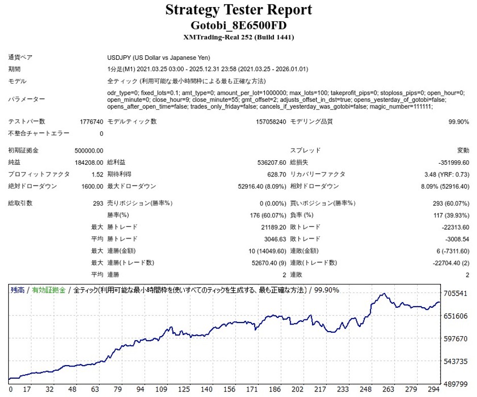 最大ポジション数は1で、ゴトー日の仲値が決まる時間帯にトレードを行うEAとなります。