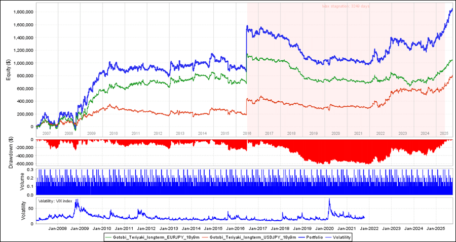 GogoJungleのGotobi Teriyakiのバックテストをしてきました。USDJPY、EURJPYで過去18年、リリース後ともにプラスでした。