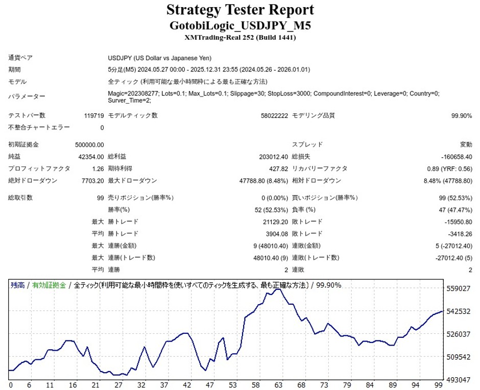 | 初期証拠金 | 500,000円 | 勝率 | 52.53% |