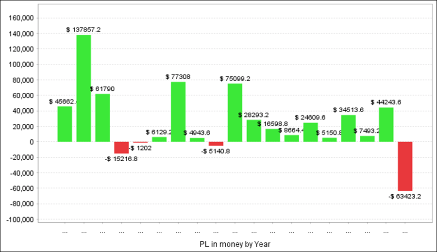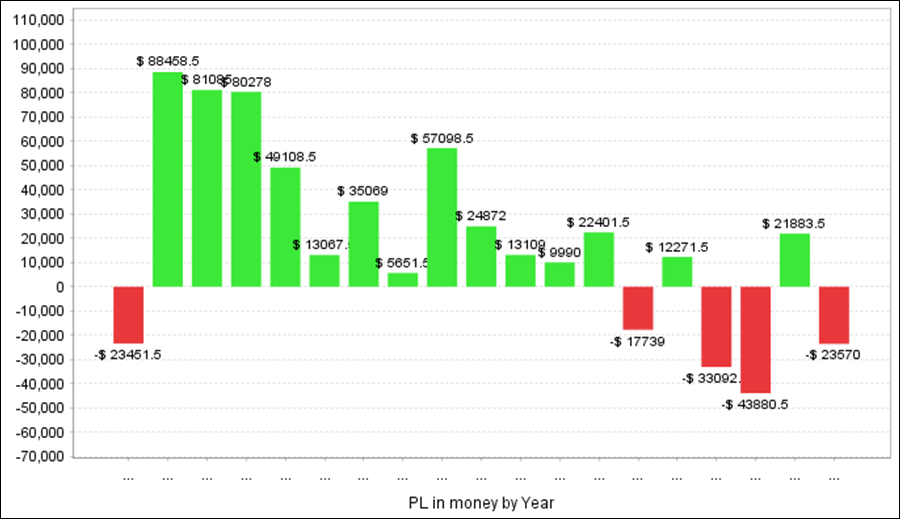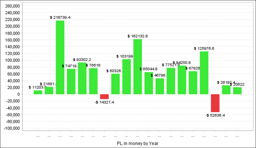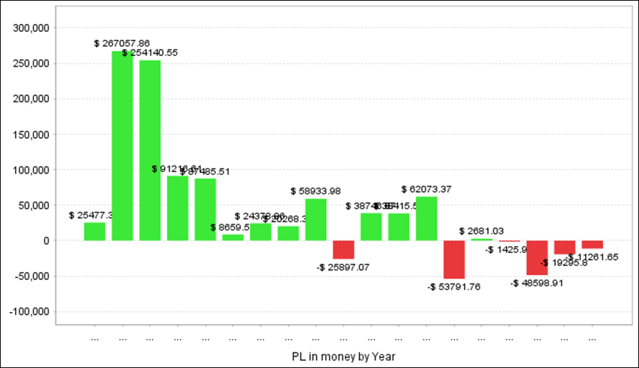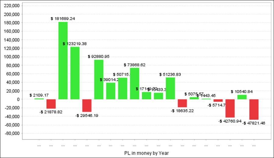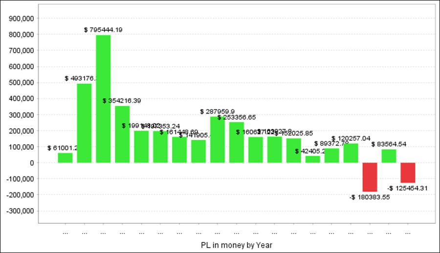 QuantAnalyzerを使って5通貨ペアを合計すると、過去18年間で+345万円の収益となりました。
