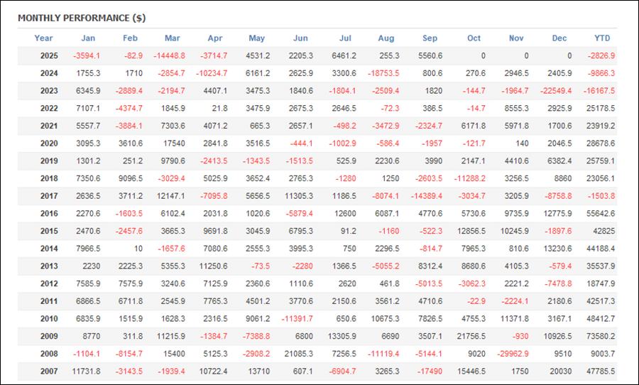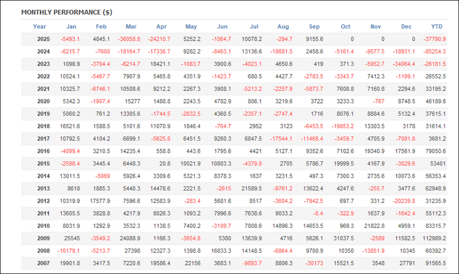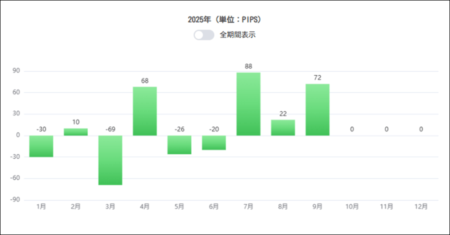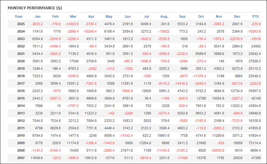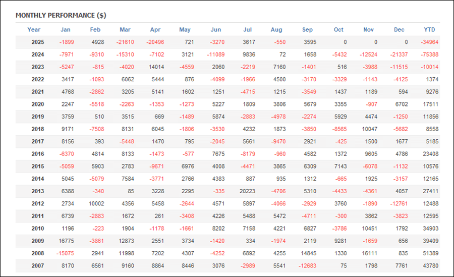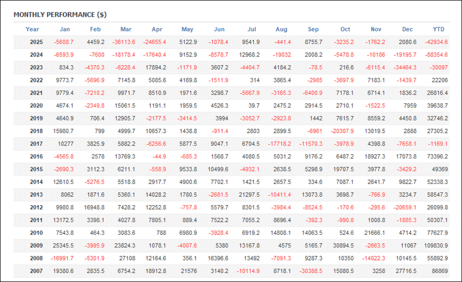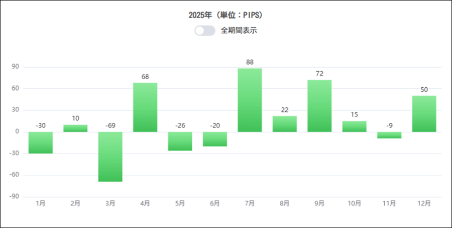 年間・月間の成績を見ると、2023年、2024年、2025年がマイナスとなっています。