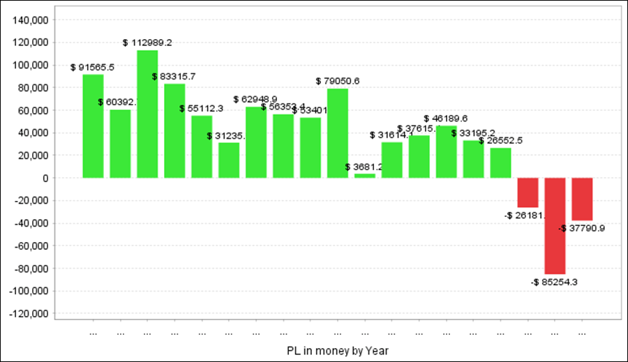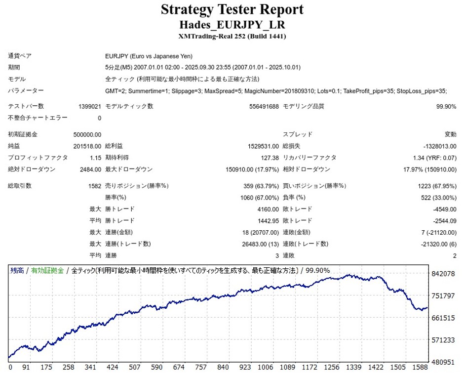 HadesのEURJPYをバックテストした結果、過去18年で+20.1万円ほどの利益を上げました。リリース後はマイナスでした。