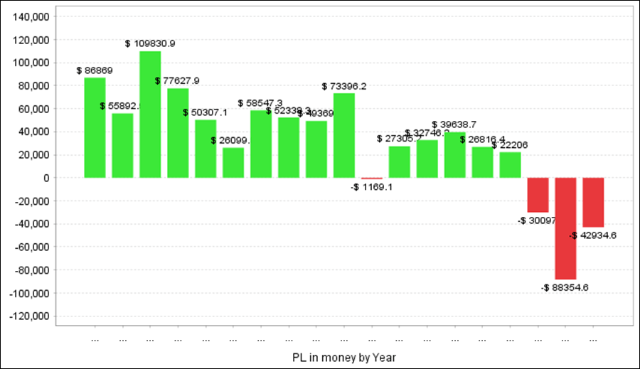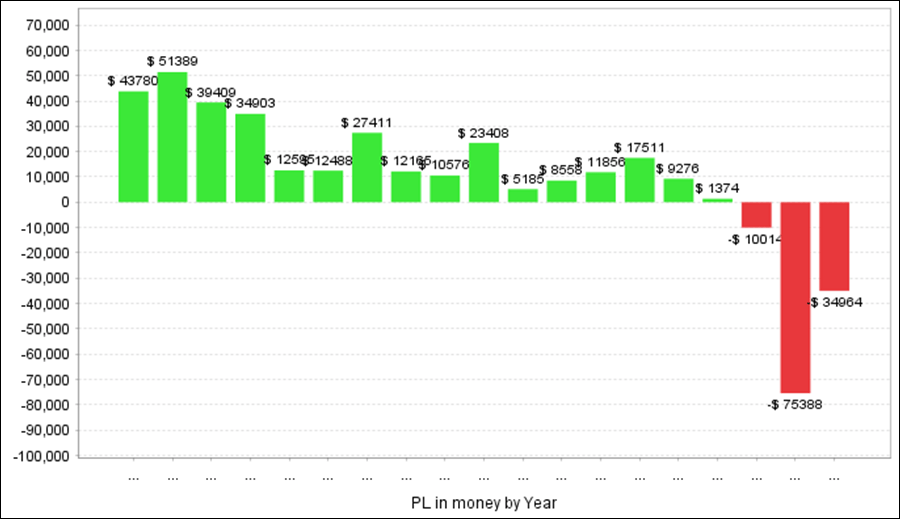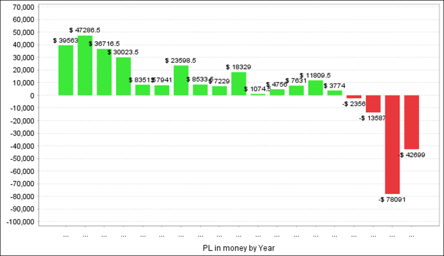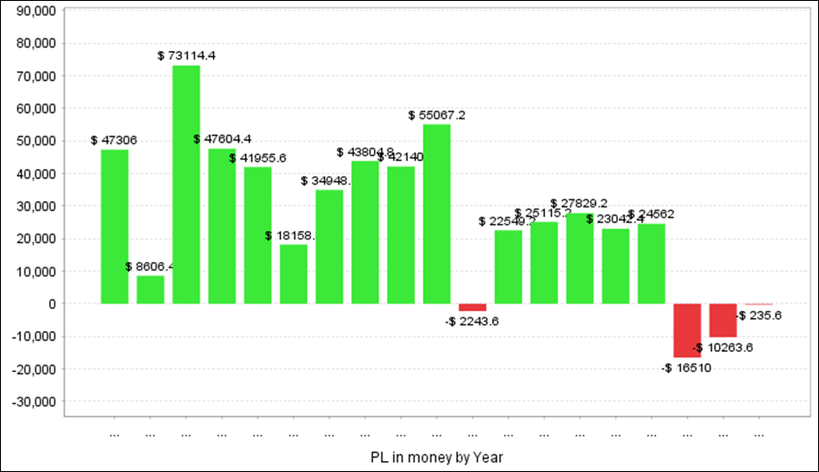 年間成績では、2023年、2024年、2025年がマイナスで、ほかはプラスでした。