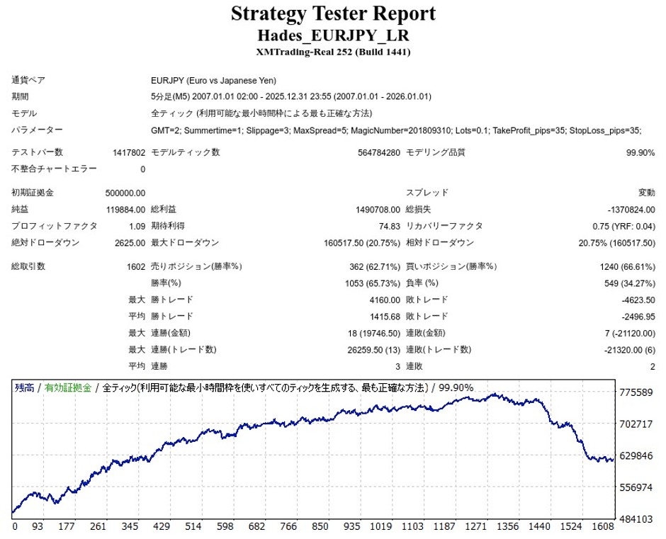 HadesのEURJPYをバックテストした結果、過去18年で+11.9万円ほどの利益を上げました。リリース後はマイナスでした。