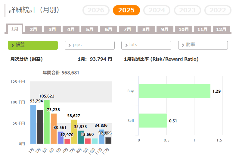 2022年~2025年の月間成績をまとめると合計で+152.0万円の結果となりました。