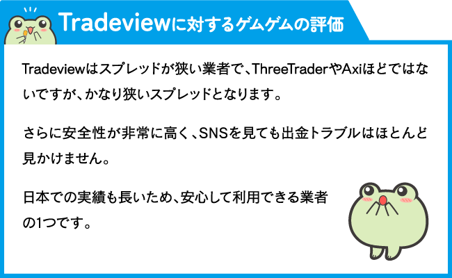 Tradeviewもスプレッドが非常に狭い業者で、禁止事項がなく出金トラブルもないので、安心してトレードすることができます。 ThreeTraderやAxiよりはスプレッドが多少広いことがありますが、安全性も考えるとTradeviewを使っても良いでしょう。