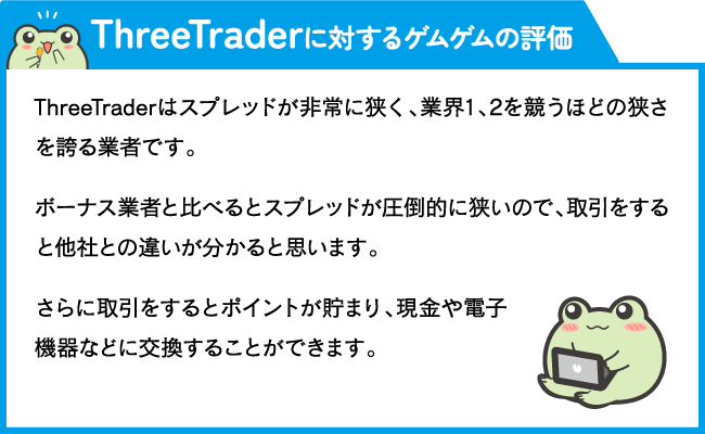 スプレッドが狭い業者でトレードしたい人はThreeTraderがおすすめです。 Rawゼロ口座の方がトータルコストは安くなりますが、Pureスプレッド口座でも十分狭いスプレッドになります。 ThreeTraderはさらにポイントも貯まるので、とてもおすすめの業者になります。