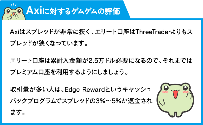 Axiもスプレッドが非常に狭くThreeTraderの次におすすめです。 エリート口座の場合はThreeTraderよりもスプレッドが狭いですが、累計入金2万5千ドル必要になるため、大口トレーダー向けです。 月間1000万ドル(約100ロット)以上取引する人は、Edge Rewardというキャッシュバックがスプレッドの3%~5%もらえるので、資金力のある人はAxiを使いましょう。