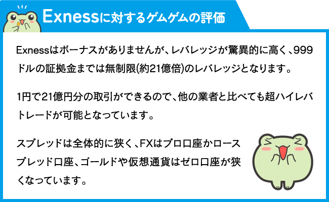 レバレッジが高い業者を希望する人はExnessがおすすめです。 Exnessは999ドルまでの証拠金の場合、無制限(約21億倍)のレバレッジでトレードが可能です。 無制限レバレッジには「10回の取引・5ロット以上の取引」が必要になるので、最初だけ2,000倍のレバレッジとなります。 1円で21億円分のトレードができるので、超ハイレバトレードが可能な業者です。