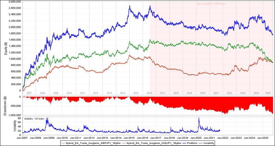 バックテストの結果は、GBPJPYは過去18年のみプラス、USDJPYは過去18年、リリース後ともにプラスでした。
