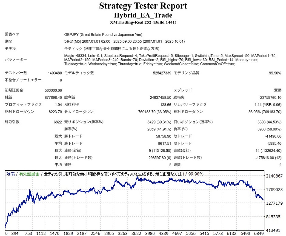 設定を変えることでGBPJPY(ポンド円)にも対応可能です。GBPJPYのバックテスト結果は以下の数値で検証を行った結果になります。