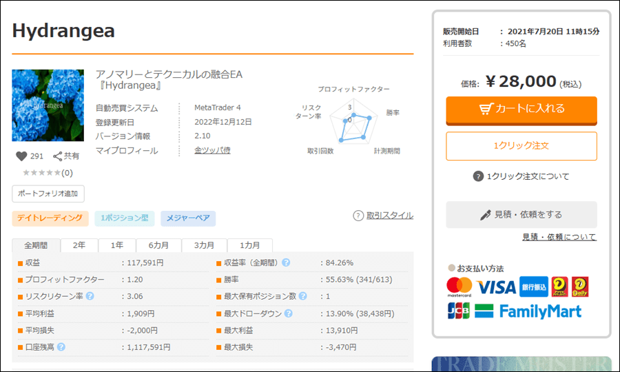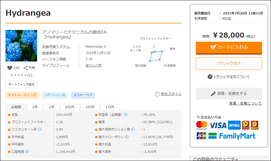 Hydrangeaは金ツッパ侍さんの提供するUSDJPY専用のアノマリー系EAですが、成績はどうなのでしょうか。