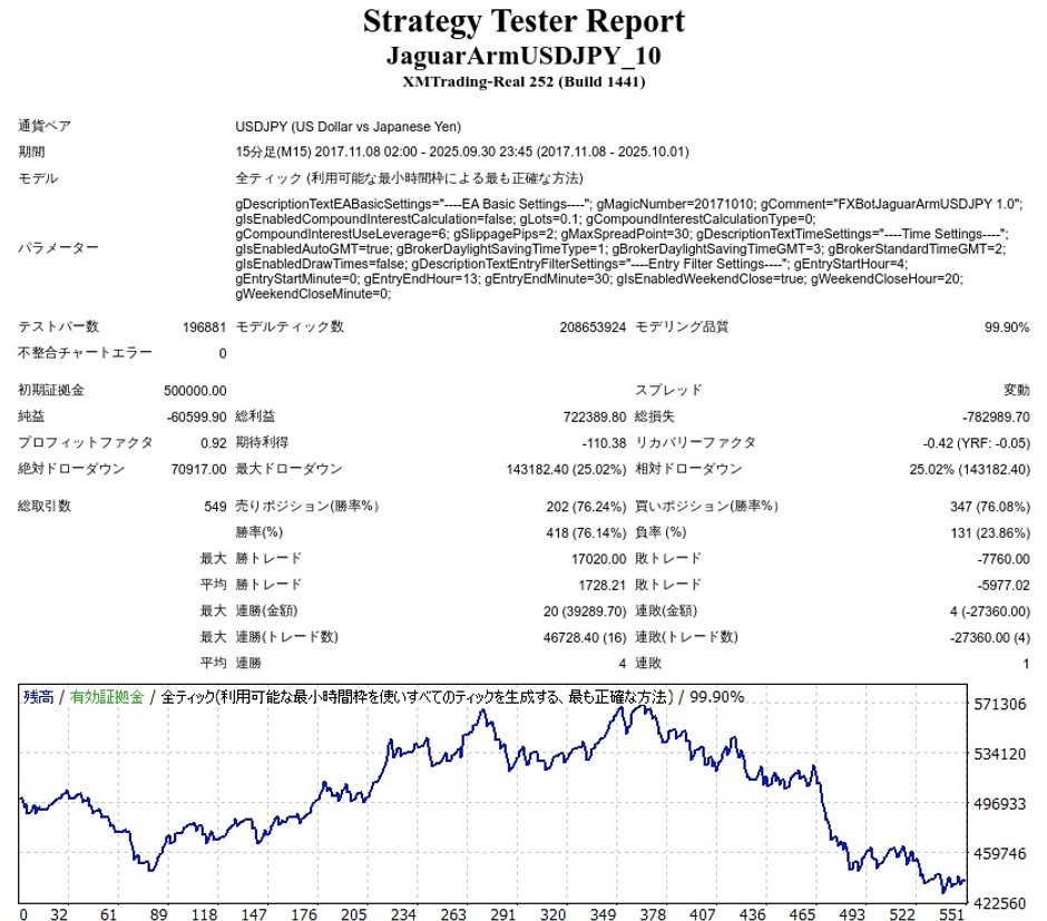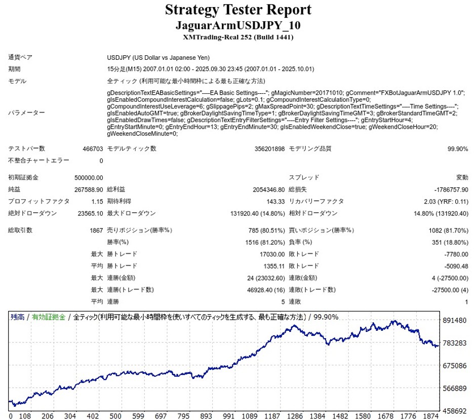 JaguarArmUSDJPYのリリース後のバックテスト結果(≒フォワード結果)は以下のようになりました。