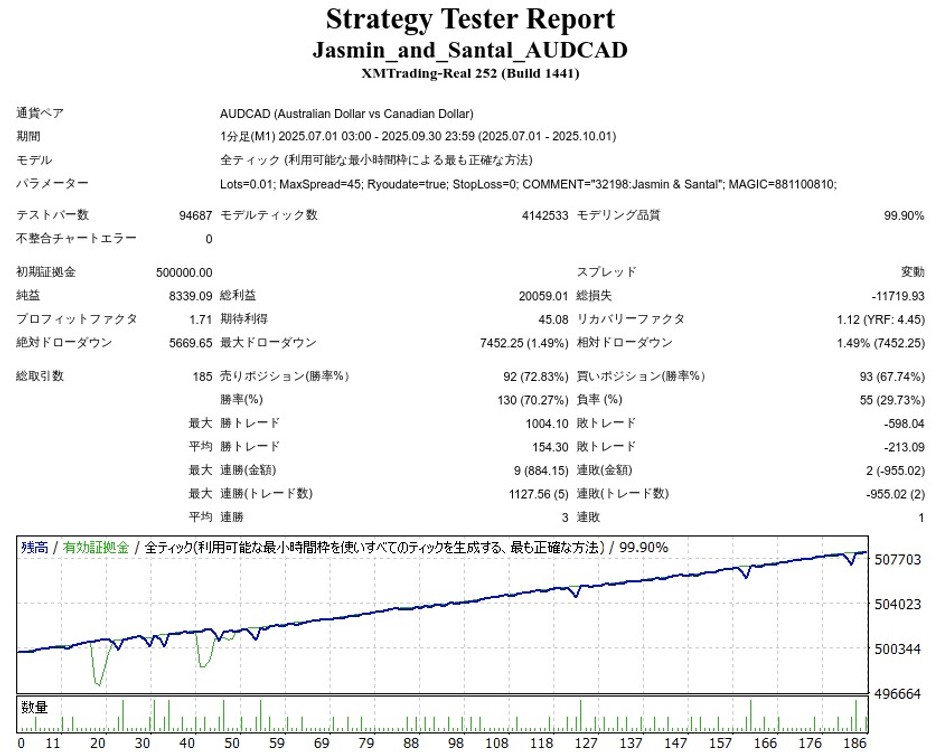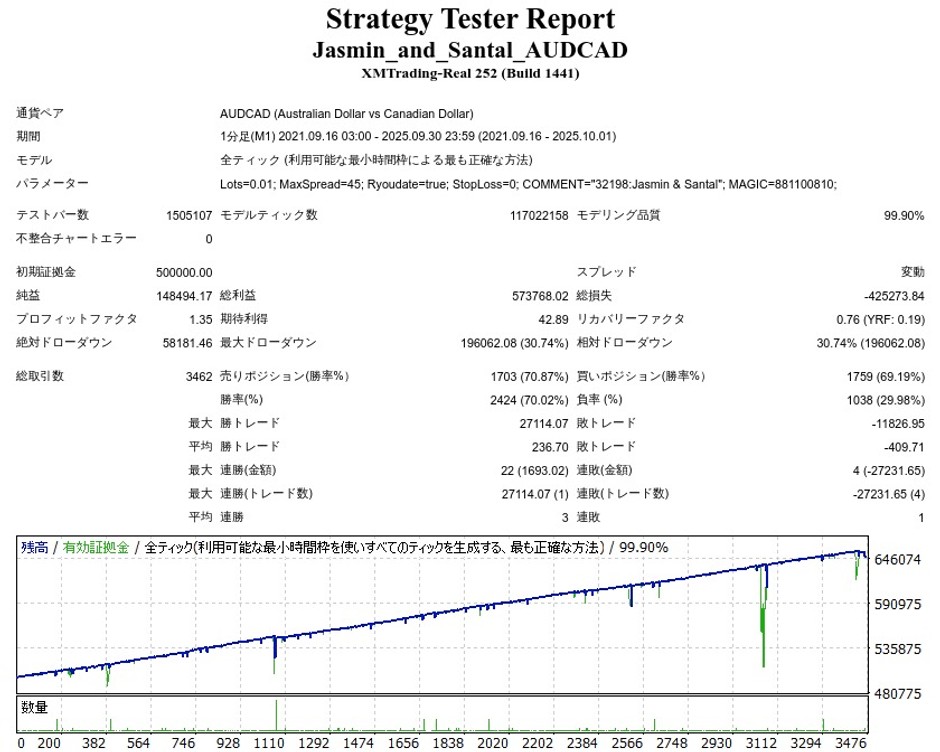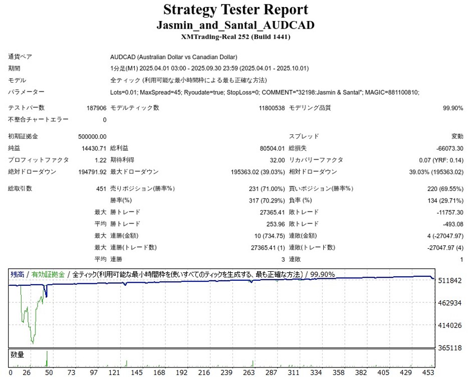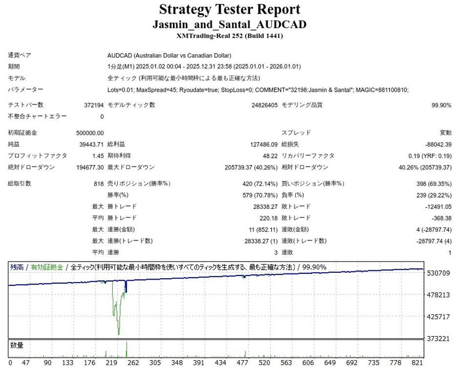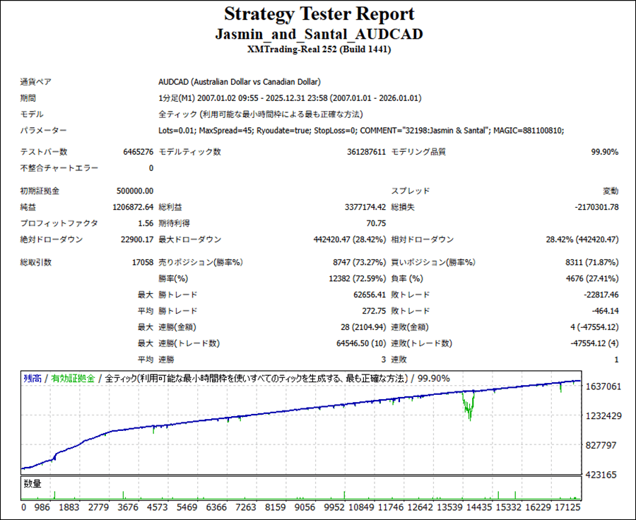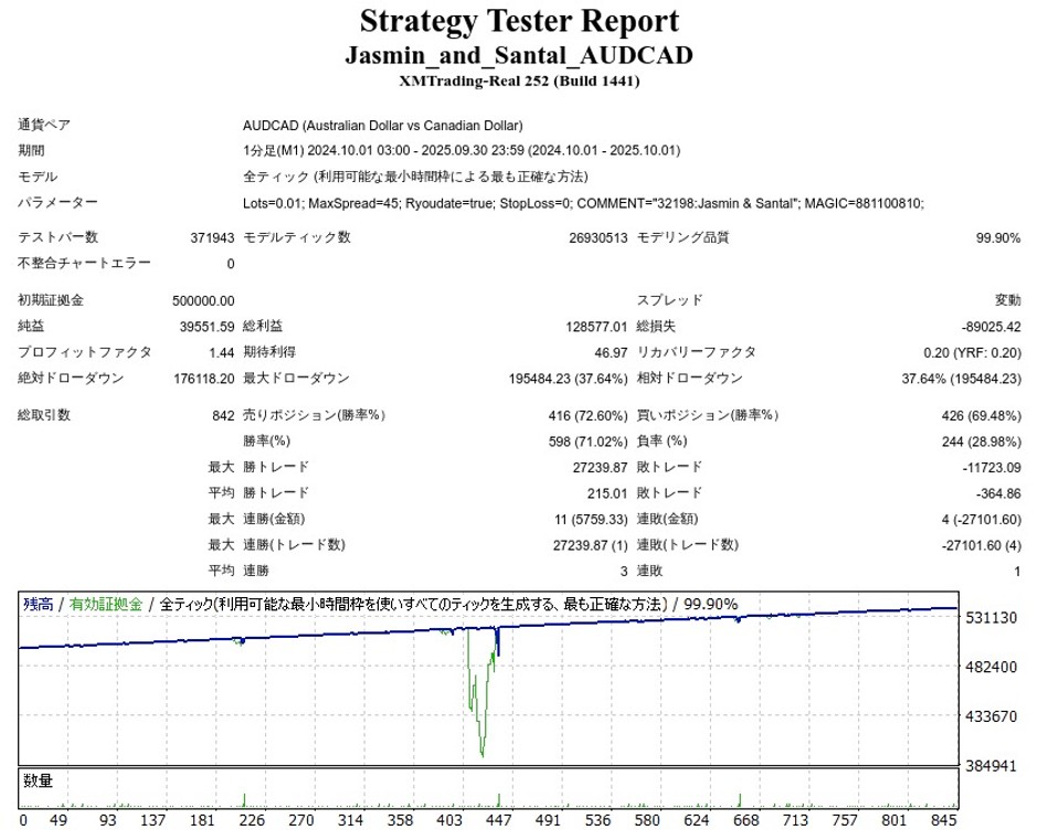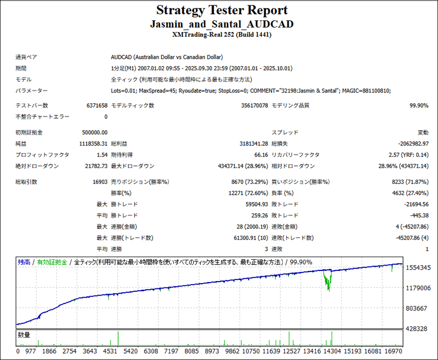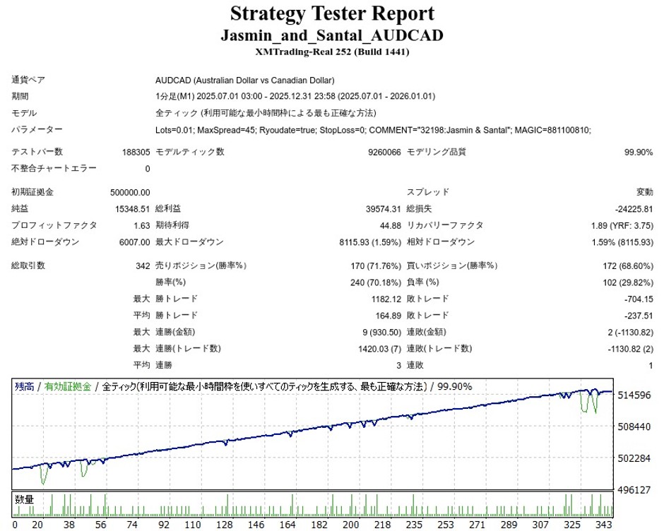 Jasmin & Santal AUDCADのリリース後のバックテスト結果(≒フォワード結果)は以下のようになりました。