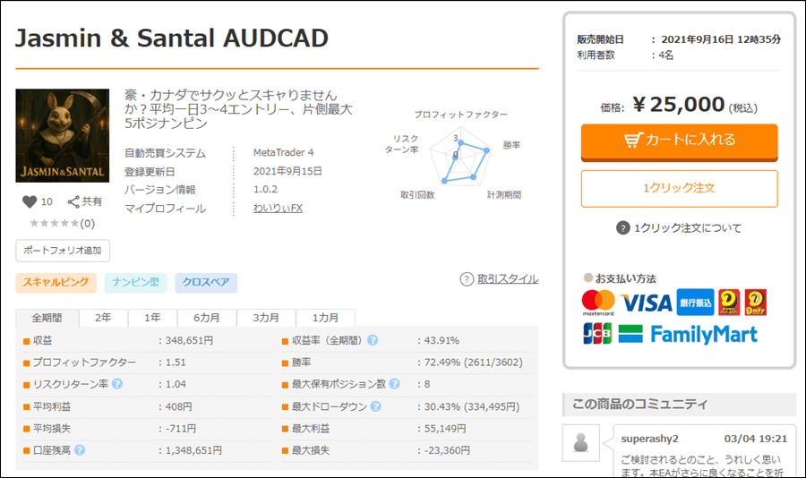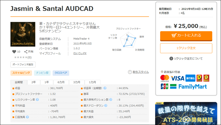 Jasmin & Santal AUDCADはナンピンタイプのEAですが、成績はどうなのでしょうか。