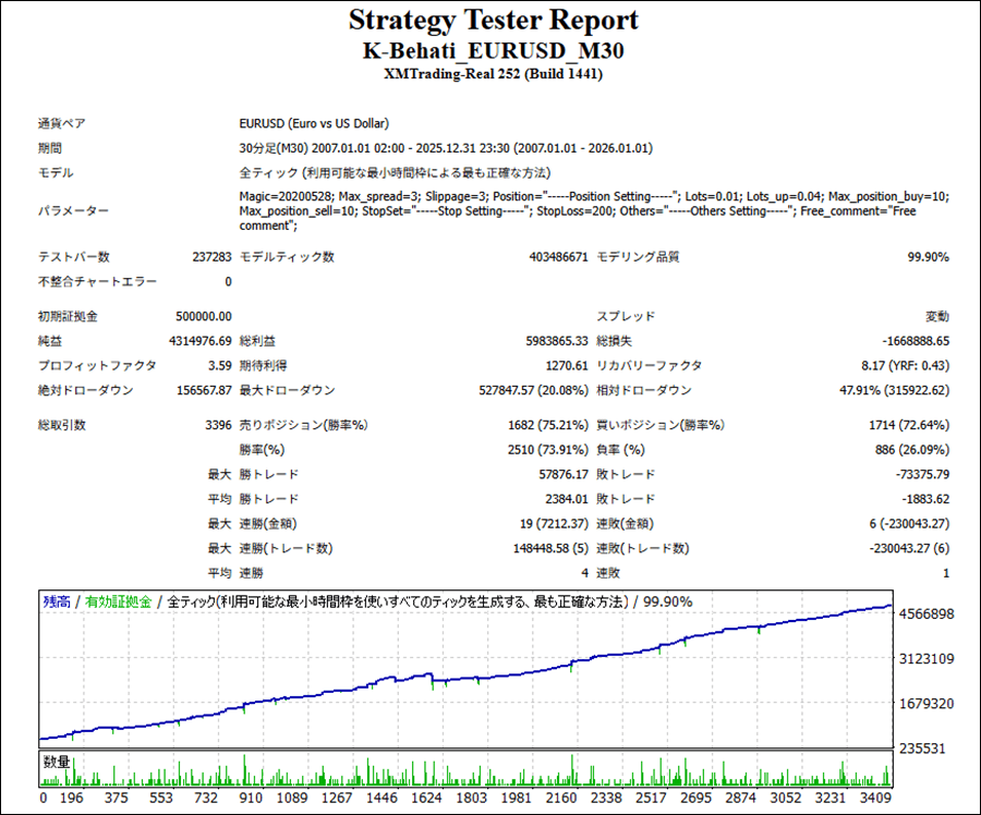 K-Behati_EURUSD_M30のリリース後のバックテスト結果(≒フォワード結果)は以下のようになりました。