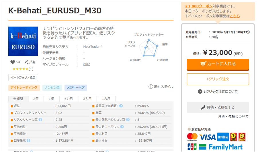 K-Behati_EURUSD_M30の詳細を確認するナンピンとトレンドフォローの両方の特徴を持ったハイブリッド型EA。低リスクで安定的に稼ぎ続けます。 | GogoJungle