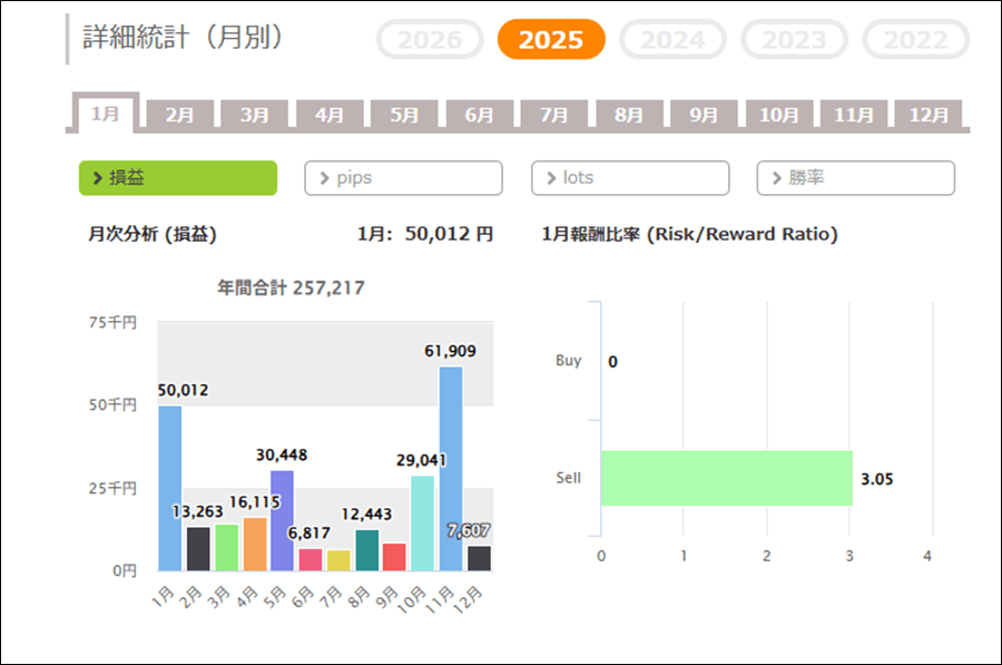 月次分析を見ると、2025年は今のところトータルでプラスです。2024年、2023年は全てプラスの収益で、2022年は4月に大きくマイナスになっています。