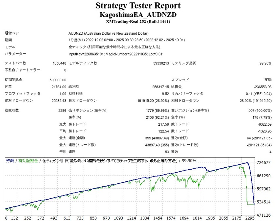 鹿児島EA<AUDNZD版>のリリース後のバックテスト結果(≒フォワード結果)は以下のようになりました。