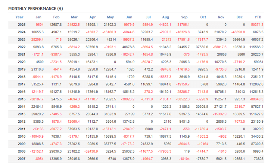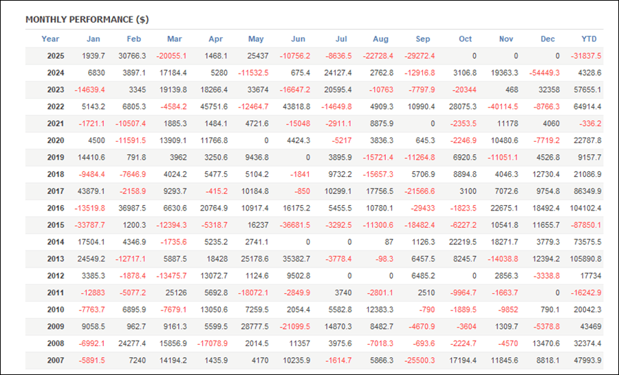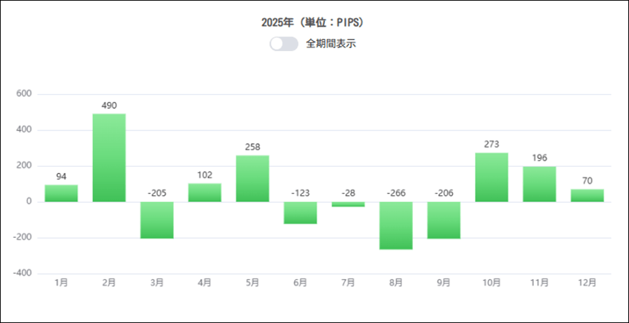 年間・月間の成績を見ると、2011年、2015年、2021年、2025年以外はプラスでした。