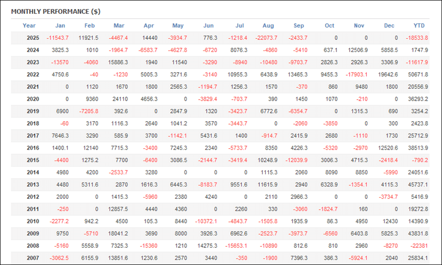 合計の年間成績では、2015年、2025年以外はプラスの成績になっています。