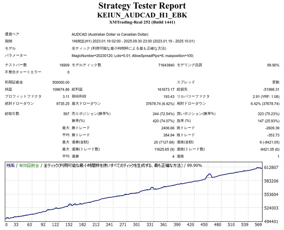 KEIUN_AUDCAD_H1のリリース後のバックテスト結果(≒フォワード結果)は以下のようになりました。