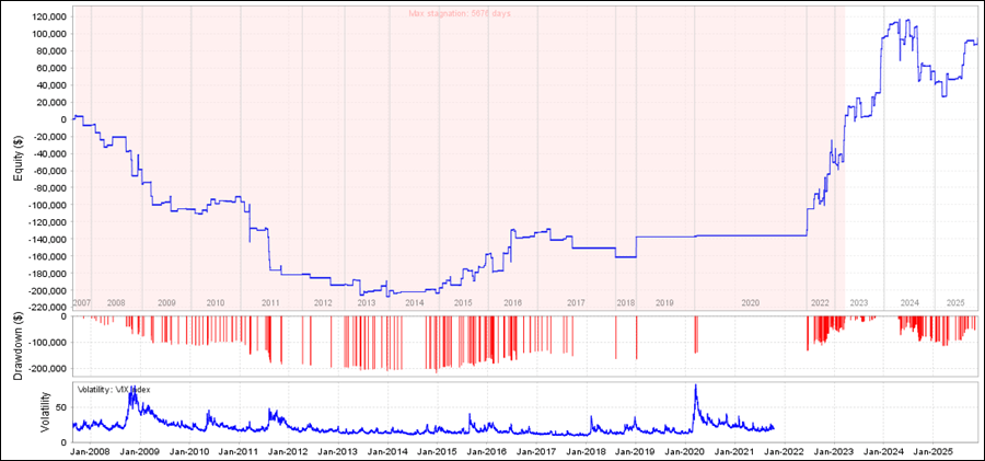 • 緊急発動FX USDJPYをQuantAnalyzerで見てみると、2007年から下落が続き、2022年から成績が上昇しています。