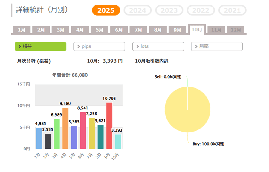| 平均利益 | 1,462円 | 最大利益 | 80,396円 |