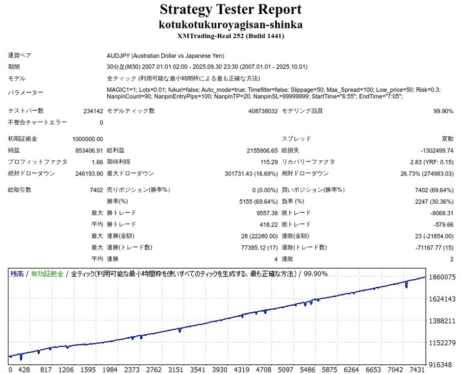 GogoJungleの コツコツじっくり くろやぎさん 進化版 AUDJPYのバックテストをしてきました。